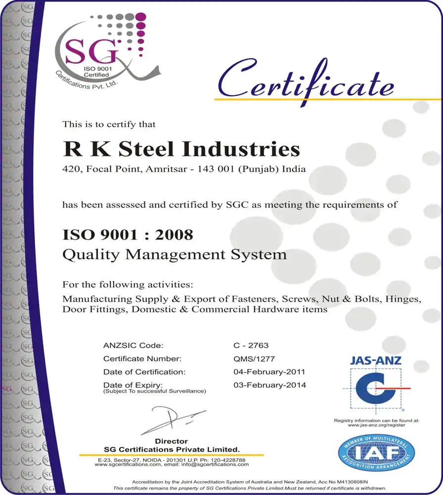 First Screws Company to maintain the Standards in manufacturing of Quality Product & get ISO 9001 : 2008 Certification